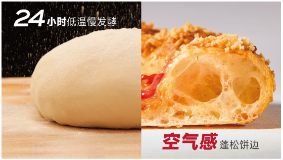 作为披萨的灵魂所在,饼底的厚度、弹性与发酵工艺直接决定了披萨的整体口感层次和风味承载能力。新·10寸手作薄底披萨饼底配方历经8个月以上、几十次的配方调整和生产线严苛测试,最终突破传统工艺桎梏,打造出独家原创饼底工艺。必胜客首次在披萨中采用了高筋面粉,增强面团延展性,加上油、水、粉的黄金配比,确保饼底软弹不易破裂,形成大而薄的10寸饼底。而饼底更复杂浓郁的风味则来源于24小时低温慢发酵工艺,带来复合风味,更在饼底内部形成自然饱满的气孔,让饼底口感更柔软,同时饼边更具空气感,在高温烘烤时更容易达到黄金比例的焦脆感。